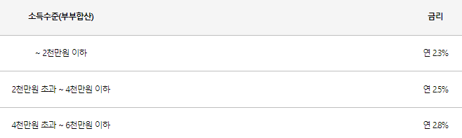 대출 금리는 연 2.8%로 변동금리 상품이며 부부합산 소득수준에 따라 아래와 같이 금리가 달라집니다.