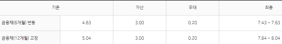 대출금리는 6개월 ,12개월 변동금리에 따라 아래와 같이 금리가 나누어집니다.