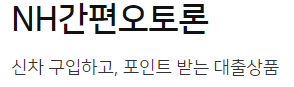 이 상품은 신차를 구입하고 포인트를 받는 대출 상품으로 상품의 정식 이름은 NH간편오토론입니다.