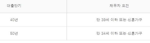 단 40년 또는 50년 만기는 신청일 현재 채무자가 아래의 요건을 충족할 경우에만 취급이 가능합니다.
