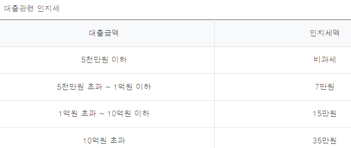 인지세란 대출 거래 신규 약정 시 내는 세금으로 대출금액에 따라 위와 같이 적용되며 이 인지세는 은행과 고객이 각각 50%씩 부담하게 됩니다.
