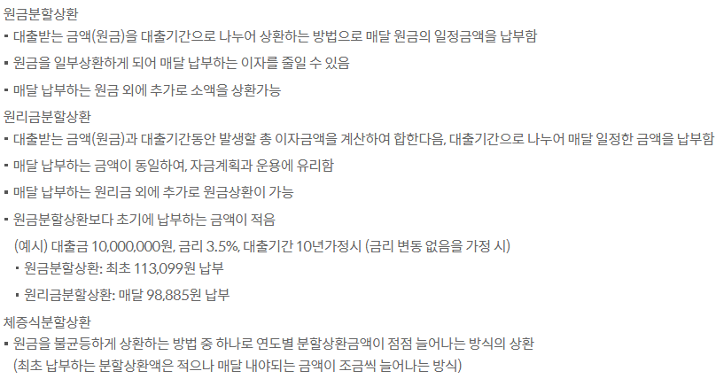 상환은 원금균등분할, 원리금균등분할, 체증식분할상환이 있으며 아래와 같습니다.