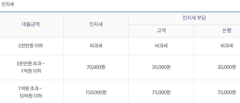 인지세는 대출금액에 따라 위와 같이 차등 적용되며 이 인지세는 은행과 고객이 각각 50%씩 부담하게 됩니다.