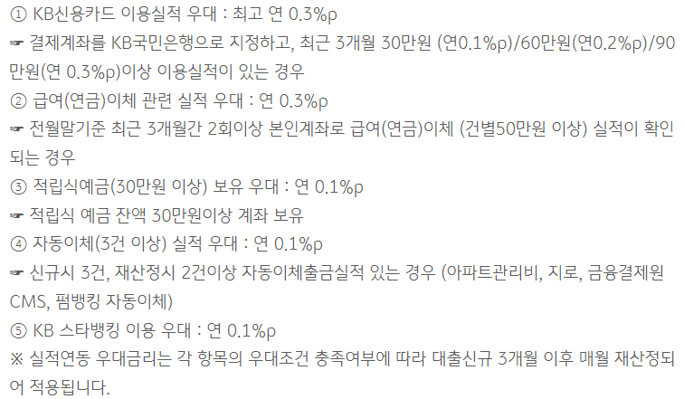 기준금리 + 가산금리 - 우대금리를 최종 적용하며 우대금리 조건은 아래와 같습니다.