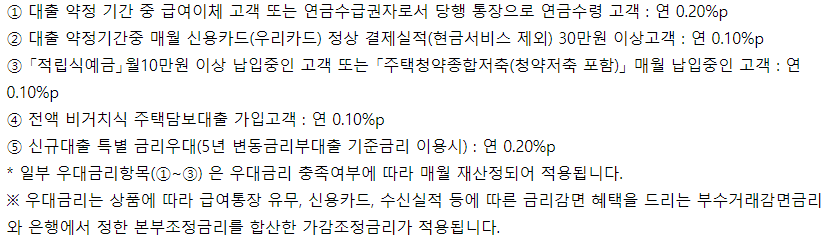 최종 적용 금리는 기준금리 + 가산금리 - 우대금리를 적용하며 우대금리는 최대 연 0.6%(1번 ~ 3번 항목 최대 연 0.4%) 제공하며 아래와 같습니다.