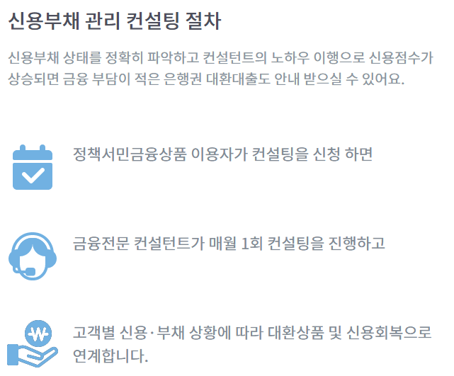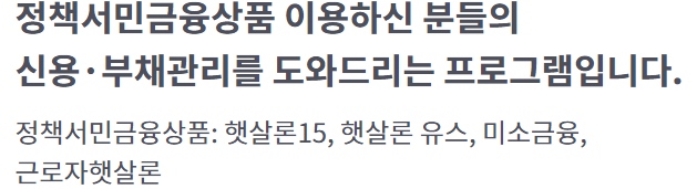정책서민금융상품 이용하신 분들의 신용·부채관리를 도와드리는 프로그램입니다. 정책서민금융상품: 햇살론15, 햇살론 유스, 미소금융, 근로자햇살론