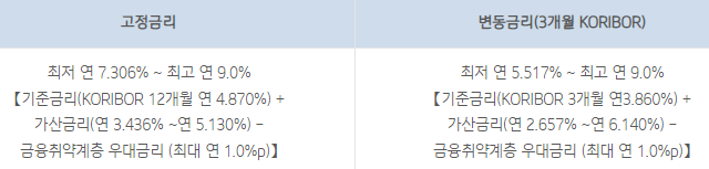 금리는 고정금리 및 변동금리 상품에 따라 다르며 아래와 같습니다.