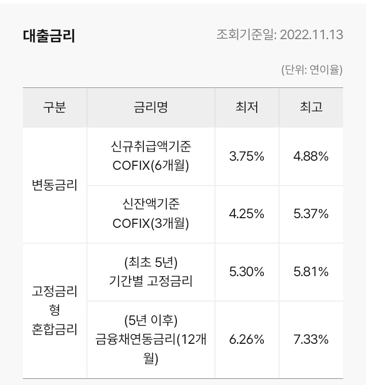 대출금리는 기준금리 + 가산금리를 적용하며 아래와 같습니다.