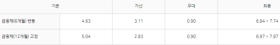 대출한도는 최대 5천만원 이내이며 대출금리는 변동금리, 고정금리에 따라 아래와 같습니다.