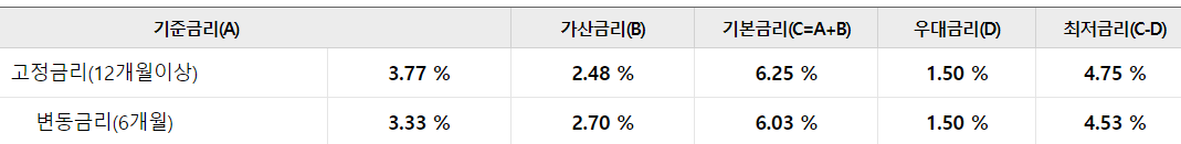 대출금리는 위 사진과 같으며 대출금리의 산정은 기준금리 + 가산금리 - 우대금리를 적용하면 적용금리가 나옵니다.