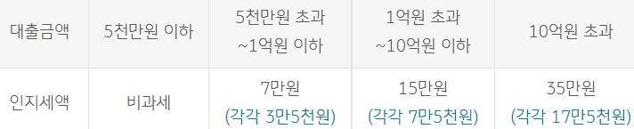 인지세란 대출 신규 계약 시 인지세법에 따라 납부하는 세금으로 대출 금액에 따라 세금이 차등 적용되며 은행과 고객이 각각 50%씩 부담합니다.