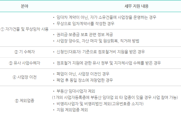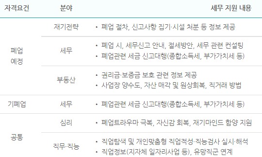 폐업 및 폐업예정인 소상공인이 지원 대상이며, 대상 조건은 아래와 같습니다.