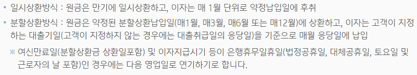 - 일시상환방식 일 경우 : 1년 이내 상환해야 하며 최장 5년 이내 연장이 가능합니다.