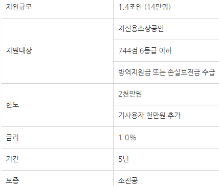 대상은 저신용자(744점이하)면서 방역지원금 및 손실보전금을 받았던 소상공인분들이라면 가능합니다.
