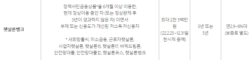 햇살론뱅크는 이미 서민정책금융상품을 6개월 이상 이용한분들 중 현재 이용중이거나 정상 상환 후 3년이 지나지 않으면서 부채 및 신용도가 개선된 저소득 및 저신용자라면 신청이 가능합니다.