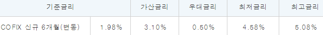 대출 금리는 6개월 변동금리 상품으로 아래와 같습니다.