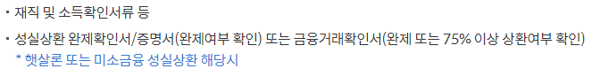 - 4대 서민금융상품 중 어느 하나를 완제 또는 현재 이용중인 4대 서민금융상품의 이용기간이 2년 이상이며 대출금액의 75% 이상을 상환한 분