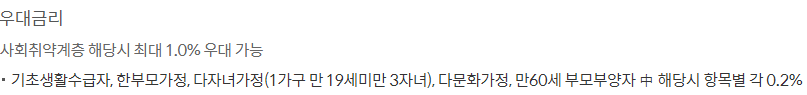 대출 금리 최종 적용은 기준금리 + 가산금리 - 우대금리를 적용하며 우대금리 조건은 아래와 같습니다.