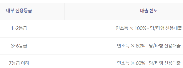 단 아래 내부 신용등급 기준에 따라 연소득의 00%만큼 빌려줍니다.