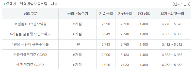 담보는 주택신보에서 담보를 해주며 금리는 아래와 같습니다.