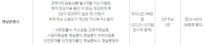 햇살론뱅크는 저 위 서민금융진흥원 상품을 6개월 이상 이용하고 현재 이용중이거나 정상 완제 후 3년이 경과하지 않은 상태에서 부채 또는 신용도가 개선된 저소득,저신용자를 위한 상품입니다.