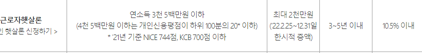 근로자햇살론은 근로자를 위한 서민정책금융상품으로 한도 2천만원 기간 3~5년 분할상환이며 금리는 10.5%이내입니다.