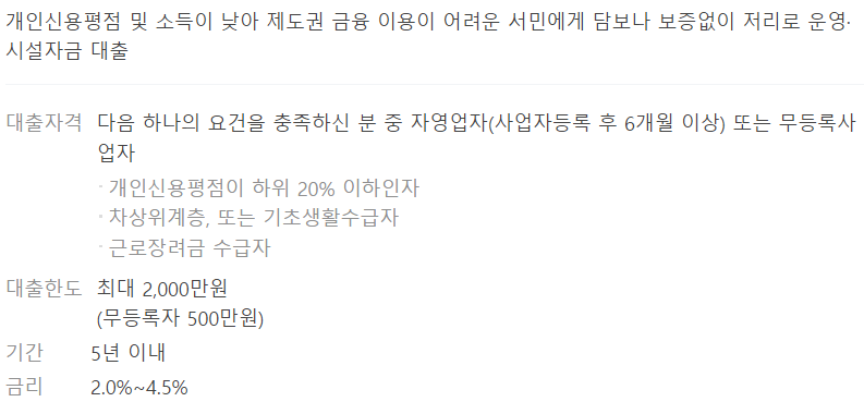 미소금융이란 개인신용평점 및 소득이 낮아 제도권 금융 이용이 어려운 서민들을 위해 담보 및 보증 없이 저금리로 필요한 자금을 대출해주는 서민정책금융상품입니다.