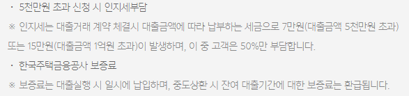 인지세란 대출거래 신규 약정 시 내는 세금으로 대출금액 5천만원 초과 시 7만원, 1억원 초과 시 15만원 등의 비과세 금액을 은행과 고객이 각각 50%씩 부담합니다.