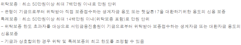 대출 한도는 위탁보증과 특례보증으로 나뉘며 보증에 따라 한도가 아래와 같이 나뉩니다.