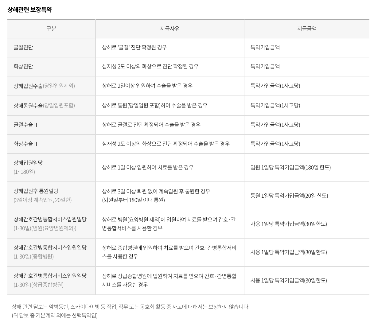 | 교통사고특약 | 상해사망, 상해후유장해, 치료비, 장해급여, 간병비, 장례비, 휴업급여, 위로금 |