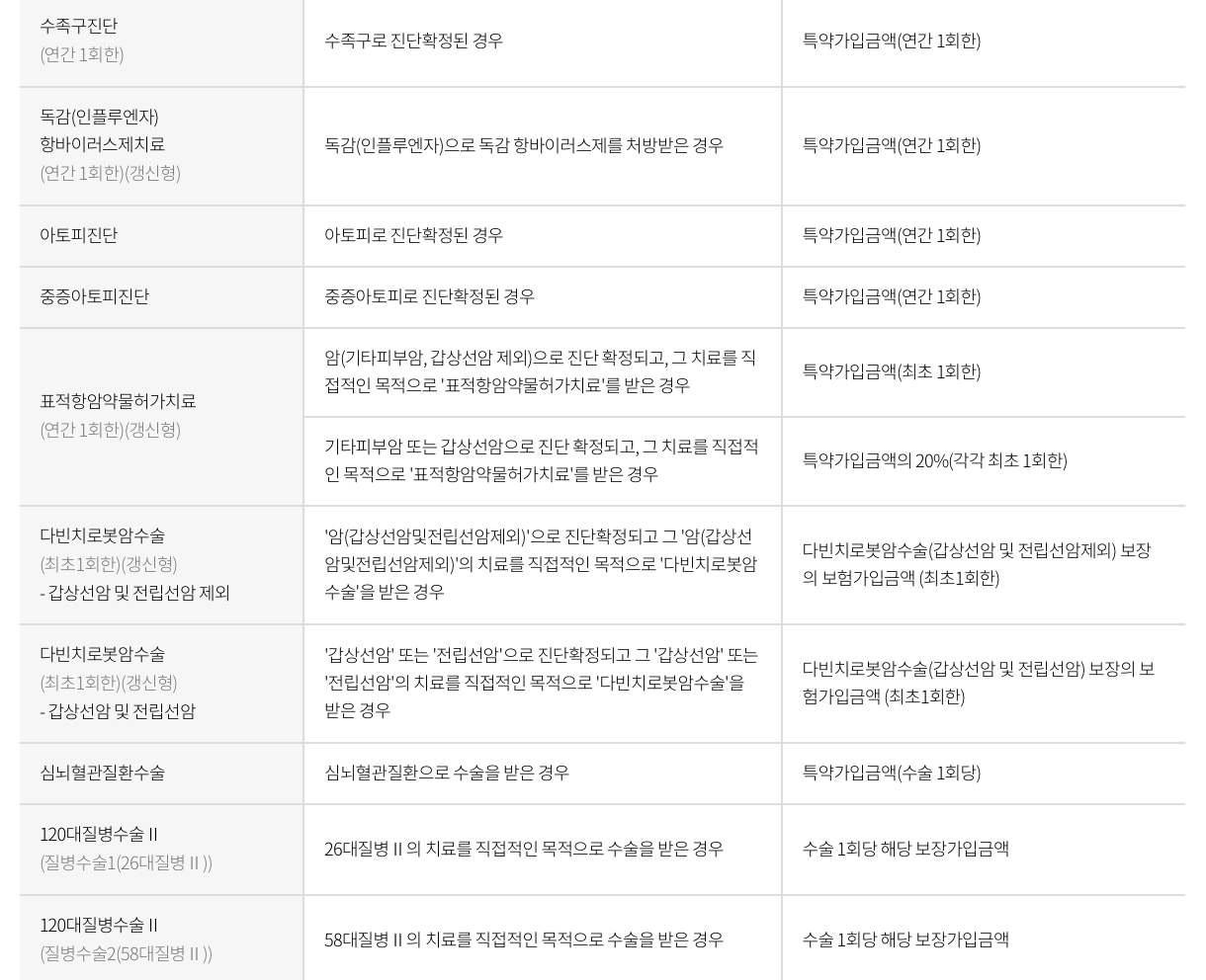 | 질병수술비 | 24대질병 또는 58대질병의 치료를 직접적인 목적으로 수술을 받은 경우, 1회당 보장가입금액 |