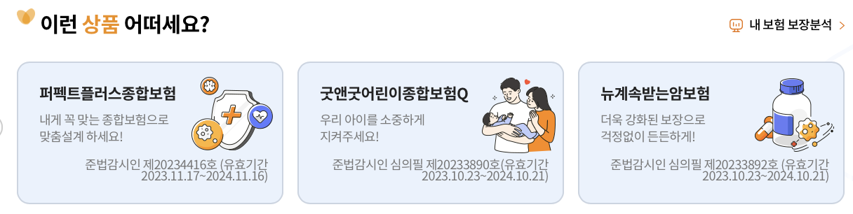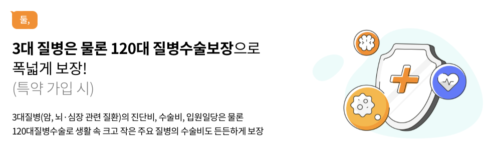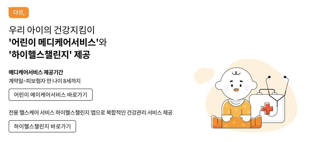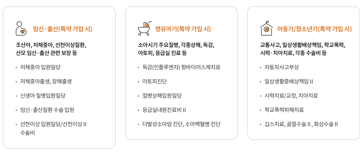 | 특약 | 종합병원입원특약, 응급실치료비특약, 골절진단비특약, 화상진단비특약, 골절수술비특약, 화상수술비특약, 해외여행보험특약 등 |