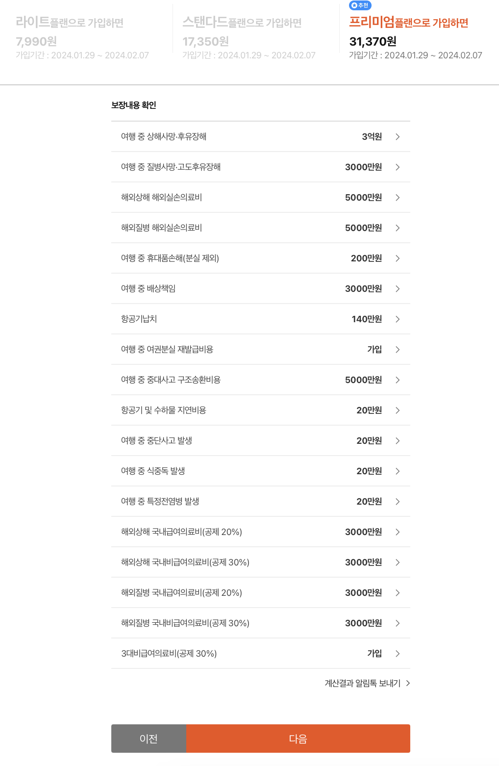 - 보장금액은 의료비는 최대 1억원까지, 사고배상은 최대 5억원까지, 짐분실은 최대 100만원까지, 여권분실은 최대 50만원까지, 비상복귀는 최대 200만원까지 입니다.