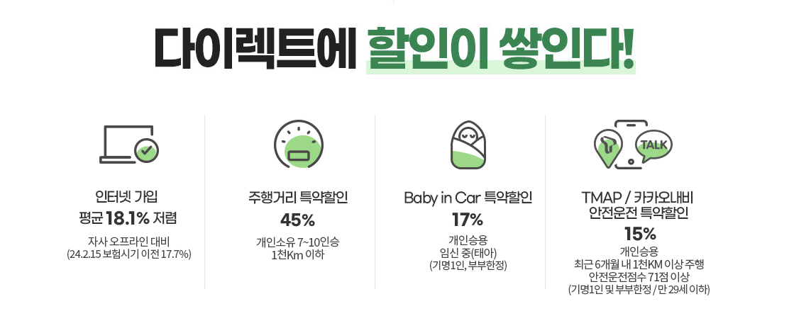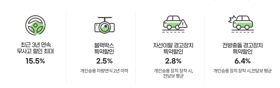 - 안전운전자 할인, 인터넷 가입 할인, 주행거리 할인 등 다양한 할인 혜택 제공