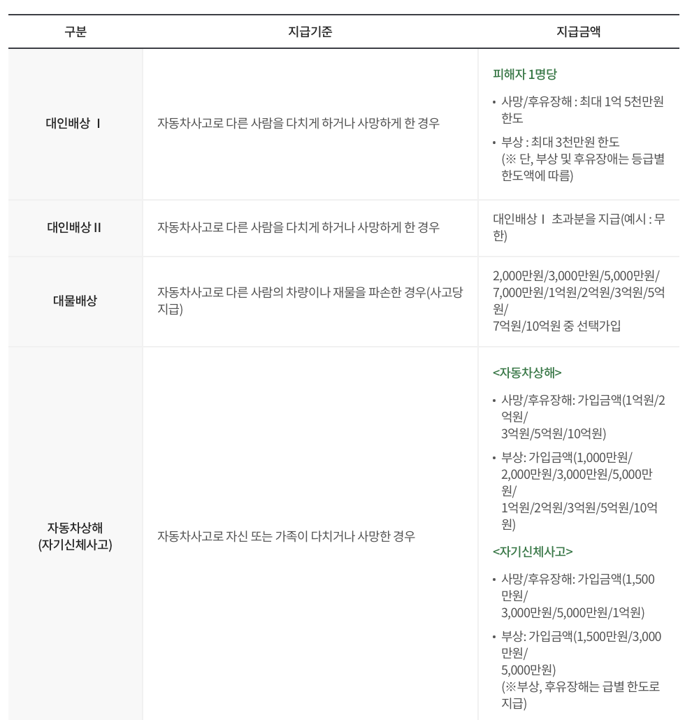 - 자동차손해배상책임보험: 타인의 신체 및 재산에 피해를 입혔을 때 보상하는 보험입니다.