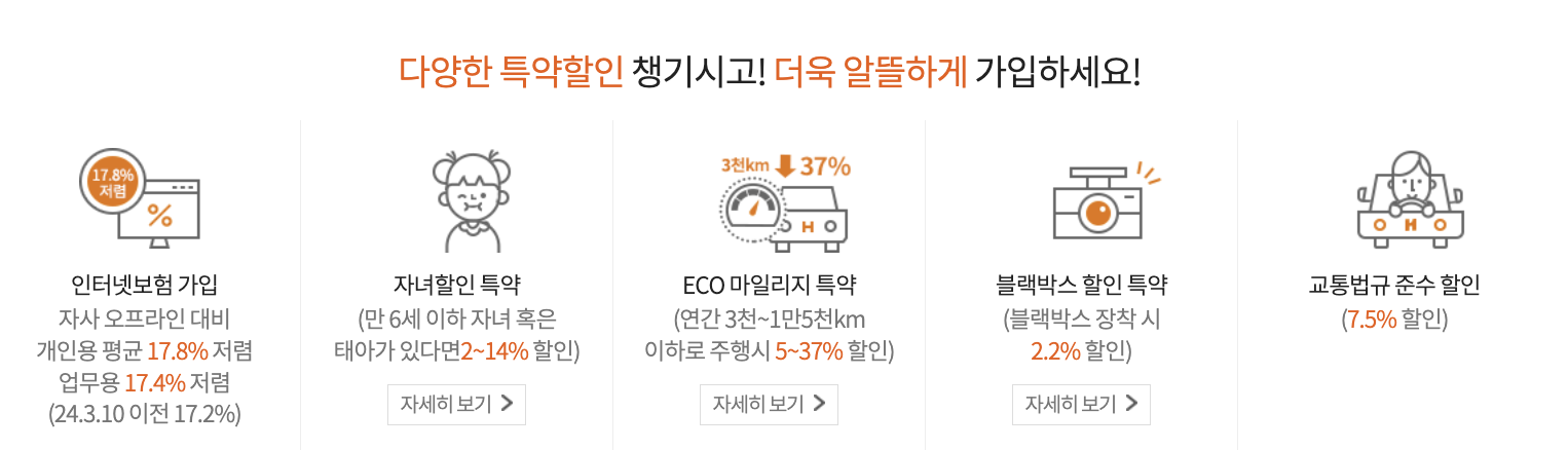- 인터넷 가입 할인, 주행거리 할인, 자녀 할인 등