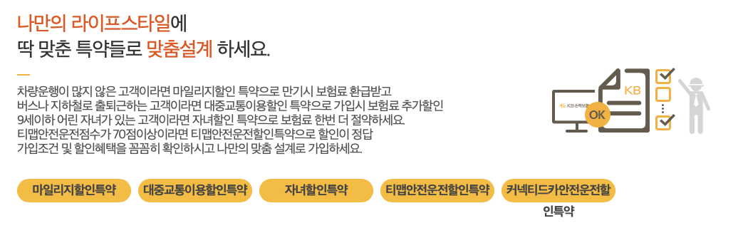 KB손해보험 다이렉트 홈페이지에서 나에게 맞는 할인특약을 확인하고, 저렴하게 자동차보험을 가입하세요.