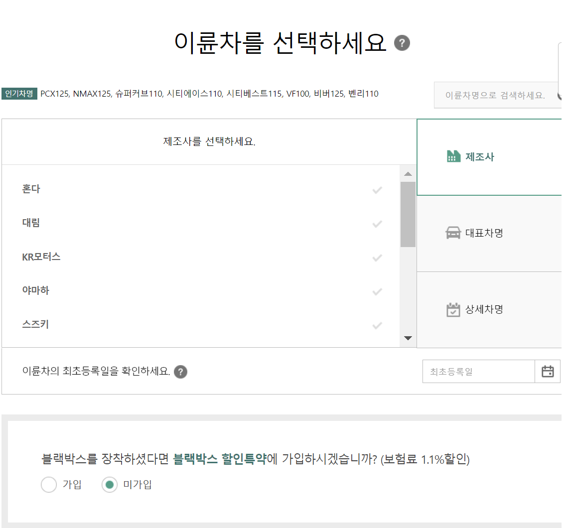 이륜차 종류를 선택 후 블랙박스 장착여부를 클릭 하시면 됩니다.
