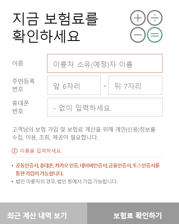먼저 이름 주민번호 휴대폰 번호를 입력 후 보험료 확인하기를 클릭합니다.