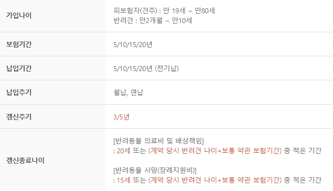 | 반려동물 장례지원비(갱신형) | 반려동물이 장례지원비보장개시일(계약일로부터 30일이 지난날의 다음날) 이후에 사망한 경우 보험가입금액의 100%지급 (단, 가입 후 2년미만은 보험가입금액의 50% 지급)(자세한 내용은 약관 참조) * 최초계약일로부터 30일 이내에 발생한 질병은 보장하지 않습니다. |