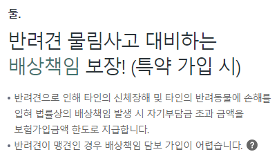반려동물 배상책임 담보는 동물보호법 시행규칙 제1조3(맹견의 범위)에 해당하는 견종은 가입할 수 없습니다. : 도사, 로트와일러, 스태퍼드셔 불 테리어, 아메리칸 스태포드셔 테리어, 아메리칸 핏불 테리어