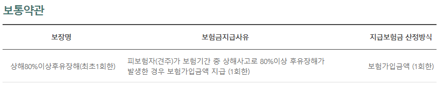 [(피보험자가 부담한 의료비 - 적용 자기부담금) X 보상비율] 과 일당 보상한도 중 작은 금액 *보상한도 [실속형] 1일당 10만원(연간 총보상한도액 1,500만원), 수술한 경우 200만원(연2회한도) [표준형/고급형/프리미엄] 1일당 15만원(연간 총보상한도액 2,000만원), 수술한 경우 250만원(연2회한도) *보상비율 [실속형] 50% [표준형] 70% [고급형] 80% [프리미엄] 90% |