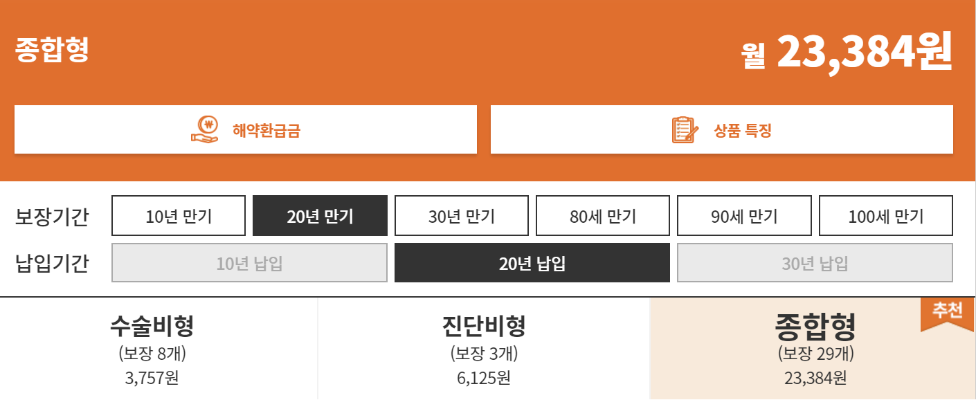 보장기간, 수술비형, 진단비형, 종합형 선택에 따라 보험료가 아래와 같이 산출되며 플랜에 따라 보장 및 보험료가 달라집니다.