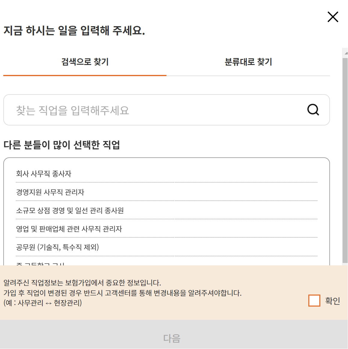 직업은 보험 가입 시 정말 중요한 사항이므로 정확히 기재하시기 바랍니다.