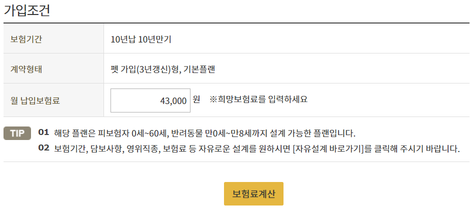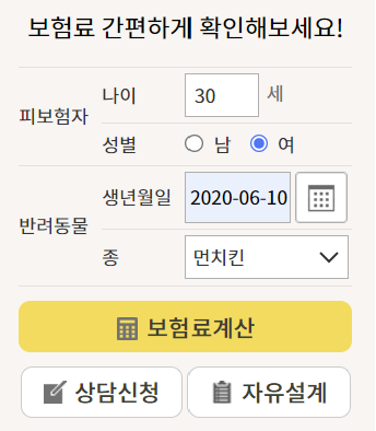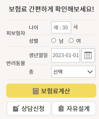 먼저 피보험자의 나이와 성별을 입력 후 반려동물의 생년월일 및 종을 입력하고 보험료 계산을 클릭합니다.