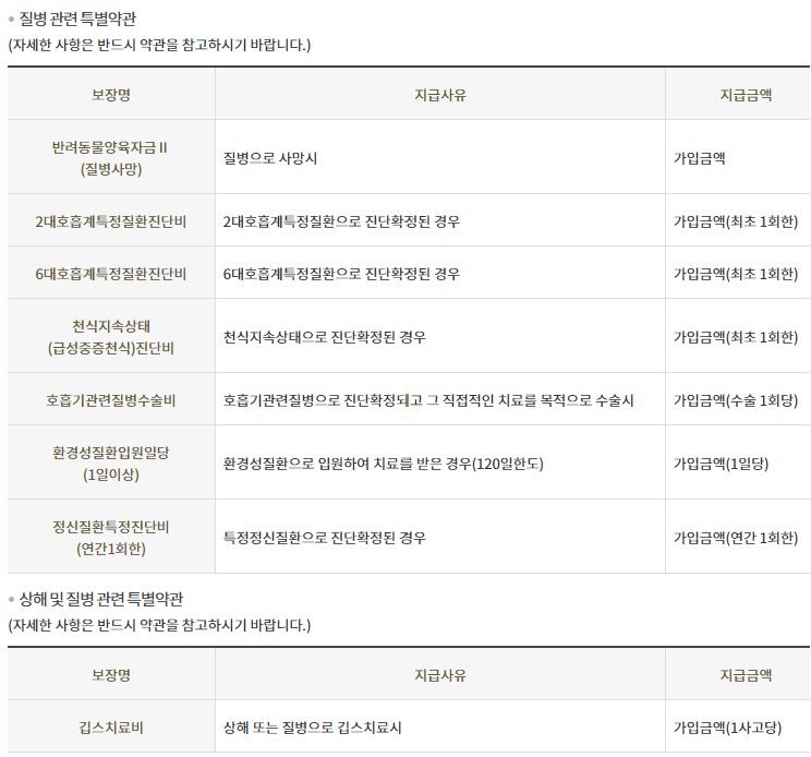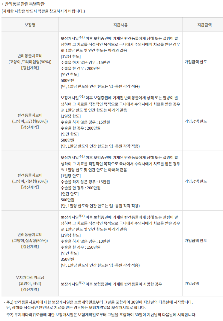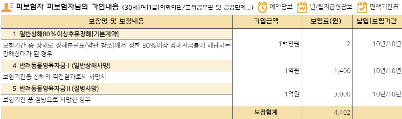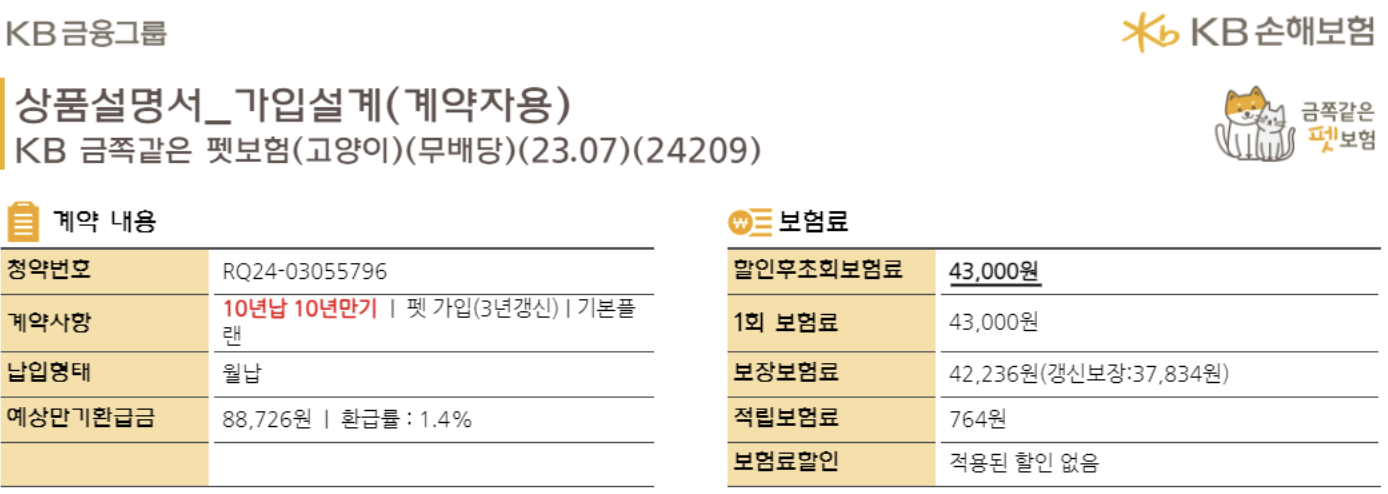 이런식으로 피보험자 및 고양이 보험의 보장내용 및 가입금액, 보험료 상세 내역이 나옵니다.