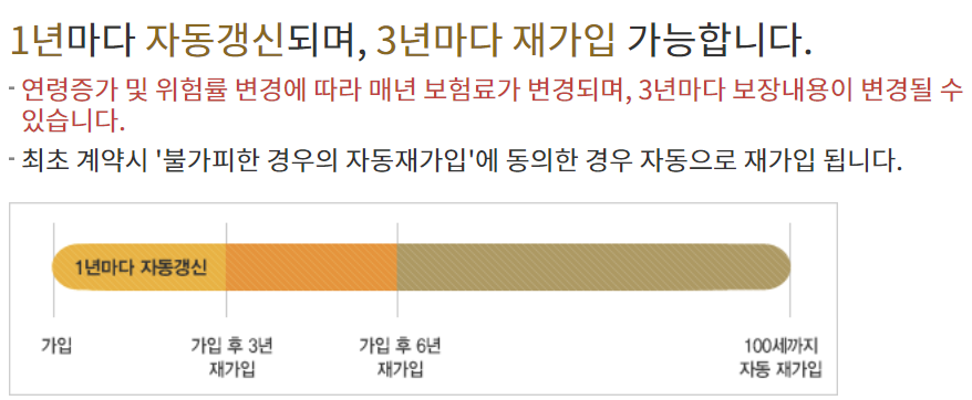 - 보장내용 변경주기는 보험가입 후 보장내용의 변경없이 자동으로 갱신되는 최대기간을 의미하며 보장내용 변경주기 종료 이후에는 회사가 정한 재가입절차에 따라 보험을 가입하여야합니다.