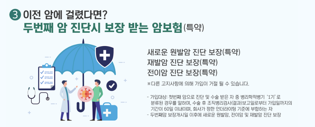 - 암 재발 보장: 암 치료 후 재발 시에도 다시 보험금을 받을 수 있어 재발에 대한 불안감을 줄여줍니다.