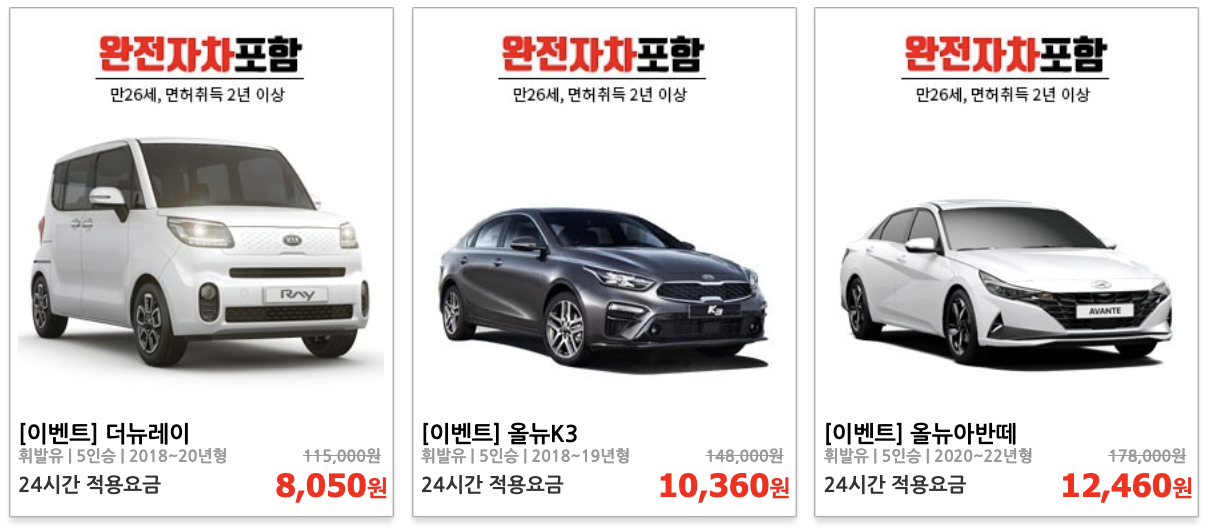 - 다양한 차종: 경차, 소형, 중형, SUV, 승합차 등 다양한 차종을 선택할 수 있습니다.