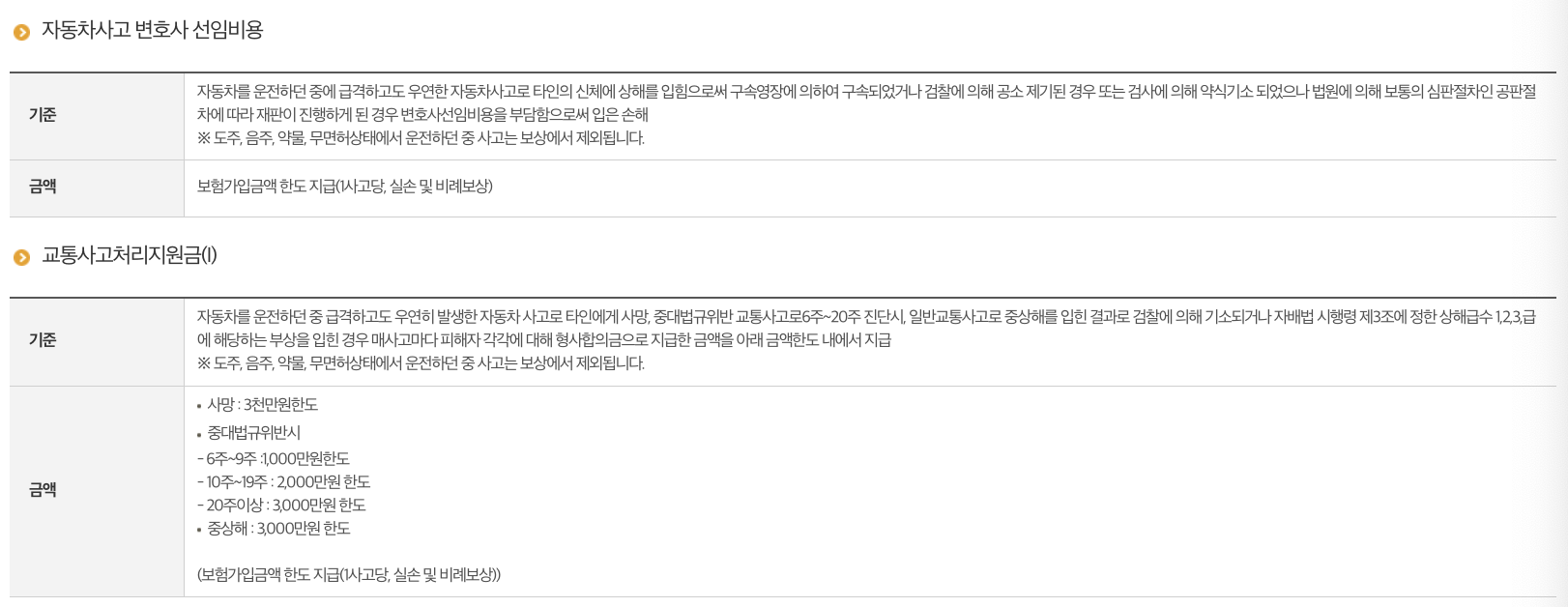 1. 교통사고 처리 지원금: 교통사고 발생 시 법적 분쟁 해결, 변호사 비용, 법원 비용 등을 보장합니다.